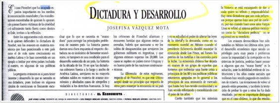 El artículo titulado “Dictadura y Desarrollo” y que firma en su calidad de “economista y consejera de Coparmex”, hace una comparación entre el régimen miliar en Chile y el del PRI: “La diferencia de estos regímenes, respecto al de Pinochet, que este último aceptó desde un principio que requería de otros para manejar la economía del país y no se adjudicó el poder de alterar las leyes de la oferta y la demanda, como en su momento sucedió con México cuando el presidente Echeverría decidió manejar la economía desde Los Pinos, así fuesen los precios de las tortillas o los controles para la leche. La economía chilena fue dejada en manos de un grupo de expertos que tuvieron que enfrentar una fuerte crisis a principios de los 80 y sus políticas públicas estuvieron apegadas en lo general a los principios de una economía de mercado que hasta hoy han tenido continuidad y se han venido consolidando con el paso de los años”.